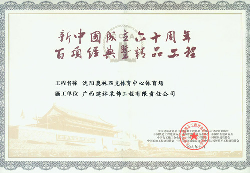 在此次活动中,我公司沈阳奥林匹克体育中心体育场工程成功入选“新中国成立60年百项经典暨精品工程”。该项殊荣的获得,使我公司在同行业中产生了重要的影响,进一步推动了建筑装饰业的发展,为实现建筑装饰业健康、可持续发展树立了光辉典范。