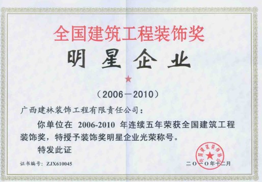 一年一度行业盛会“全国建筑工程装饰奖颁奖大会”于2010年12月25日在北京召开。广西建林装饰工程有限责任公司喜获丰收,不仅荣获2010年度全国建筑工程装饰奖及 “明星企业”的优秀称号,而且成为全国19家、广西唯一一家连续“十年荣获全国建筑工程装饰奖、连续六年荣获明星企业”称号的企业。这不仅展现了公司的雄厚实力,而且使建林装饰强势晋级为广西唯一一家 “全国建筑工程装饰奖星级明星企业”。